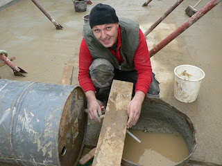 Donderdag hebben we alles nog eens mooi uitgepompt en de grachtjes nog eens opnieuw beetje verbreed en verdiept, alsook met een tuinslang en een sproeikop erop de modder vanonder de muren gespoten. Dit lukte nog wel vrij goed (onze Kärcher had het immers begeven), hiervoor dienden wij wel in de smurrie er buiten te lopen en niet meer op de vloerplaat te lopen. We doen alles om het proper te krijgen en houden totdat de beton er vrijdag na de middag ingaat.